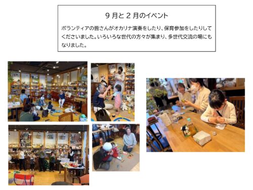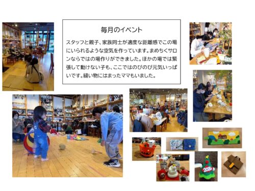 たくさんの親子の成長をボランティアの方々と見守ることができた半年でした。小さな場ならではの強い絆や連携が生まれ、次のステージへ移るみなさんを見守ることができました。これからは、今までのような月に一回の開催にはこだわらず、地域のイベントに参加したり、休日を利用して小さなサロンを設けるなど、職場復帰した家族達が戻って来られる場を用意したいと思います。それから、新しく生まれたボランティアの方々とのつながりも大事にしたいです。イベントの際には仲間として、縫い物をしながらおしゃべりをしたり、こどもの成長を一緒に喜んだりする時間を作りたいと考えています。