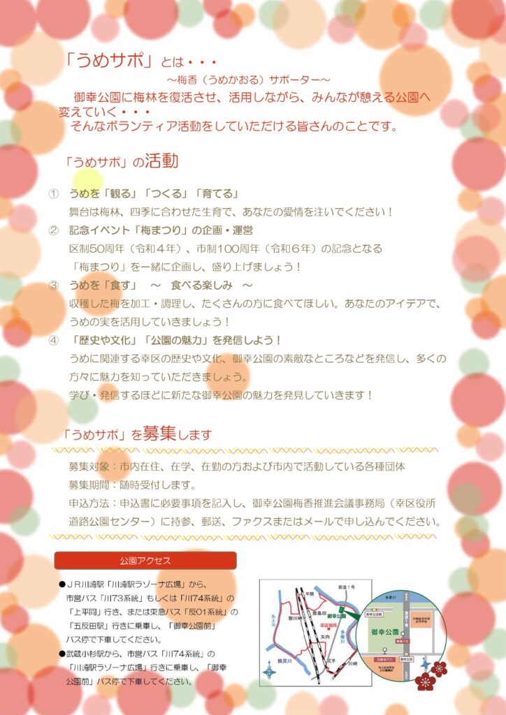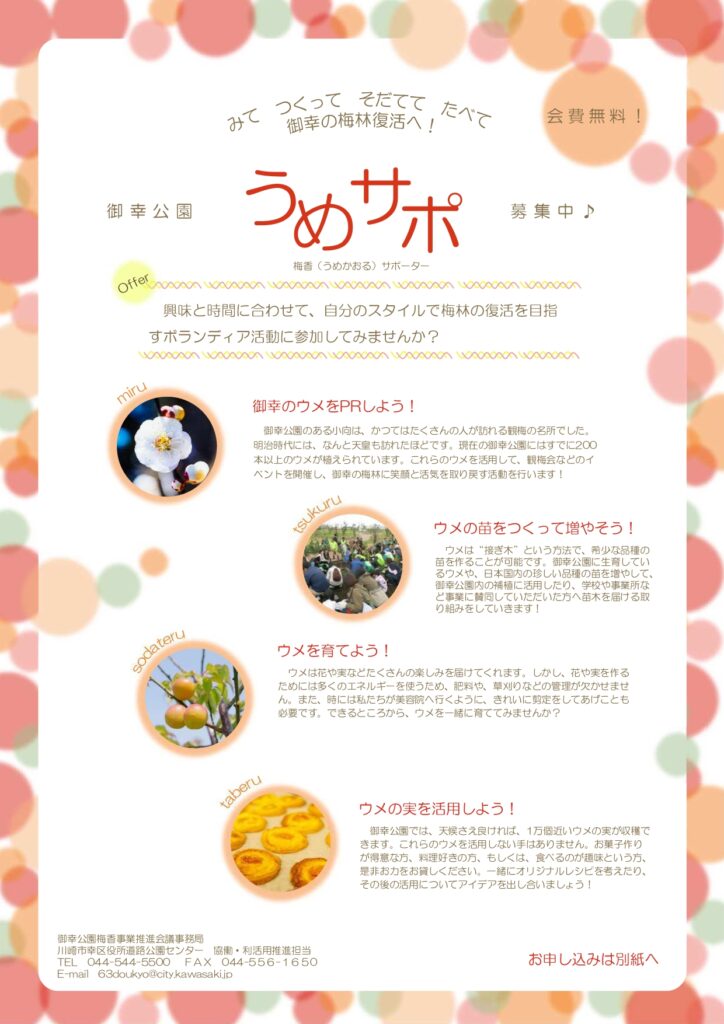 幸区・御幸公園”梅香(うめかおる)サポーター募集 2024年4月30日 まちのおと管理者 イベント ”御幸の梅林復活へ!” 幸区・御幸公園「うめサポ」募集中♪ うめを「観る」「つくる」「育てる」ボランティア活動に興味のある方、ぜひ参加してみませんか~? 応募方法、詳細は こちらから