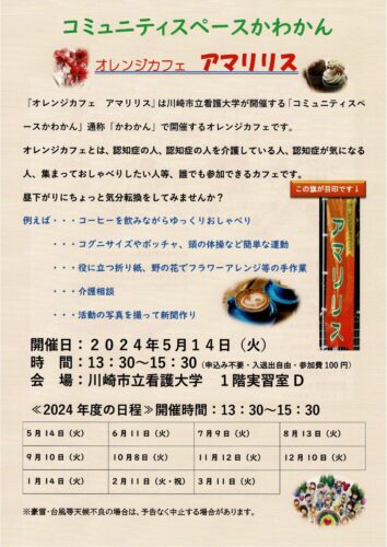 川崎市立看護大学のコミュニティスペースでも「オレンジカフェ アマリリス」として、定期的に場が開かれています。体操やフラワーアレンジメント等ちょっとした活動もご用意しているそうです🏵️