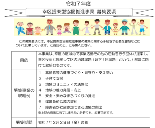 幸区役所では、地域の課題を地域の団体・行政などが協働して解決していくための新しい事業の提案を募集しています。実施する事業は公開プレゼンテーションなどにより選考。選考された団体は、その事業を定められた方法で期間内に実施していただきます。みなさんからのご提案をお待ちしています!