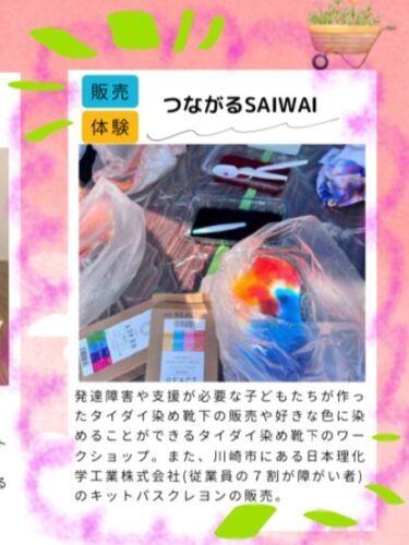 地域や社会をより良くしていくために活動をする市民活動団体が、活動にまつわるワークショップや体験会、グッズ販売を行っています。なかでも、2024年度のまちのおと協働事業を受託された”つながるSAIWAI”さんが出展、タイダイ染めのワークショップを開催されます!ぜひ体験してみてくださいね!