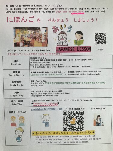 Hello, people from overseas who have just arrived in Japan or people who want to obtain JLPT certification, why don’t you come to S-SDC desk of Town Cafe, and talk with me!