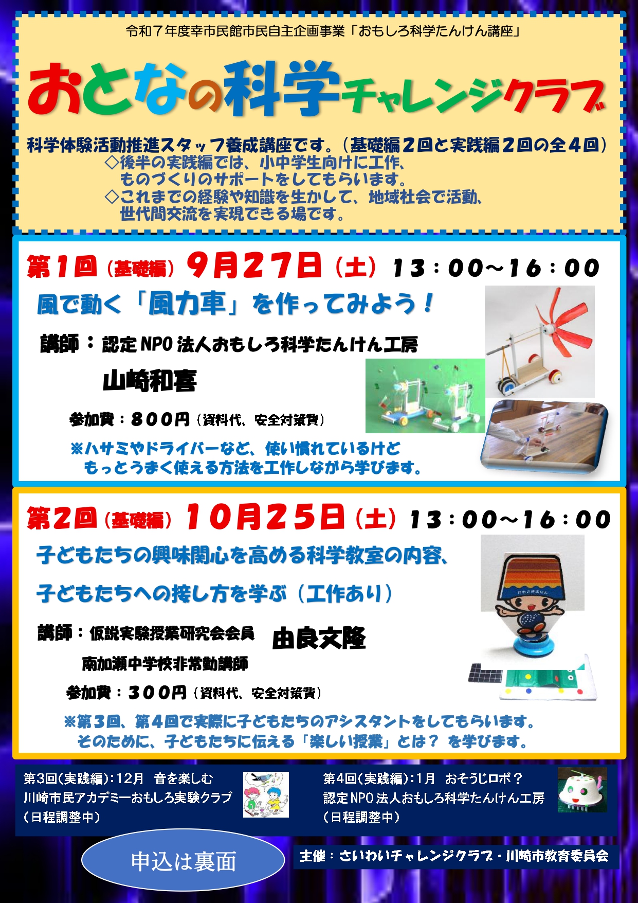 参加者募集!科学体験活動推進スタッフ養成講座 2025年9月2日 まちのおと管理者 イベント 《おとなの科学チャレンジクラブ》 子どもたちに科学の楽しさを伝えるための、科学体験活動推進スタッフ養成講座が始まります。 基礎編では工具の使い方や子どもたちへの接し方などを、実践編では実際に子どもたちのアシスタントを通じて「楽しい授業」について学んでいきます。 お申し込みはこちらから!詳しくはチラシをご確認ください。