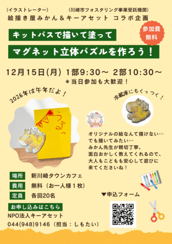 12/15(月)9:30~/10:30~ マグネット立体パズルを作ろう! 2025年12月1日 まちのおと管理者 イベント ~大人も子どもも遊べます~ お米由来の優しい素材で作られた画材”キットパス”で描いて、塗って、 マグネット立体パズルを作ろう! みかん先生が優しく、面白く、教えてくれます。 大人も子どもも楽しめるので、ぜひ安心して遊びに来てくださいね! ■日時:2025年12月15日(月)9:30~11:30 ☆第一部9:30~ ☆第二部10:30~ ■場所:新川崎タウンカフェ ■定員:各回20名 ■参加費:無料 ■主催:NPO法人キーアセット ■お問合せ・お申し込み:044‐948‐9146 担当:下平(しもたい)