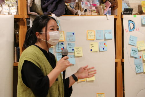 一番多かったのは幅広い世代の方が参加できる交流の場があると良いという意見。次いでお酒が飲める気軽な(敷居の低い)イベント。 参加者の平均年齢が高めなこともあり昔よく街中で見かけた伝言板のようなものがタウンカフェ内にあるといいなという意見もありました。 発表の中には、「メンバーには人たらし(周りの人から愛されやすい人)が多い」という言葉が出て、このような地域貢献活動をされている方は人のためまちのためにという思いを持って行動されている方が多いんだろうなと感じました。