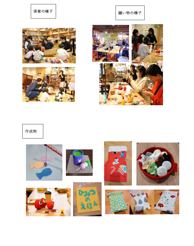 目標に掲げていた「縫い物の時間と親子参加のおはなし会」の分離は非常に難しく、できた回の方が少なかった(8回中2回実施)。縫い物を軽くしておはなし会に親子参加すると、親にとっては物足りなく、2時間フルに縫い物にすると、おはなし会だけ参加する親子の対応ができない。(実施中はおはなし会だけの参加者はいなかった)どちらを重視するということなく、これからもそれぞれのできる形を模索していきたい。作業に時間を取られるため、アンケートは実施しなかったが、口頭で参加者の声を拾った。