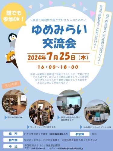 夢見ヶ崎動物公園について、魅力を高め、動物公園を核とした地域コミュニティを活性化させるため、周辺で活動する方、地域の方たちなどが情報交換し、動物公園を活用した未来のコミュニティについて語り合う場として続けられています。川崎市幸区役所が主催ですが、市民主体で続けられている交流会です。