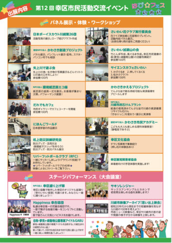 市民活動団体がパネル展示で活動をPRしたり、体験コーナー、ステージパフォーマンスを開催する、子どもからシニアまでどなたでも楽しめるイベントです。