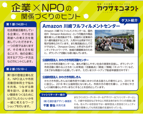 テーマは「企業×NPO の関係づくりのヒント」で、Amazon川崎フルフィルメントセンターが登壇企業として紹介され、社会貢献活動の事例発表がありました。