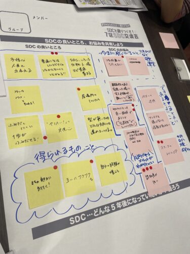 グループに分かれ、①SDCのいいところ、お悩み②SDCが5年後どうなってほしいか、のテーマで意見交流をしました。SDCで普段取り組んでいる活動や属性も様々なメンバーでしたが、共感できる話題がたくさんあり、とても盛り上がりました。