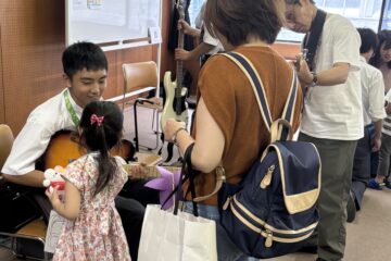 後半は、高校生バンドの皆さんが演奏と楽器のふれあい体験。はじめはおそるおそるの子どもたちも、徐々に積極的に楽器に触るようになり、目がキラキラしていました!