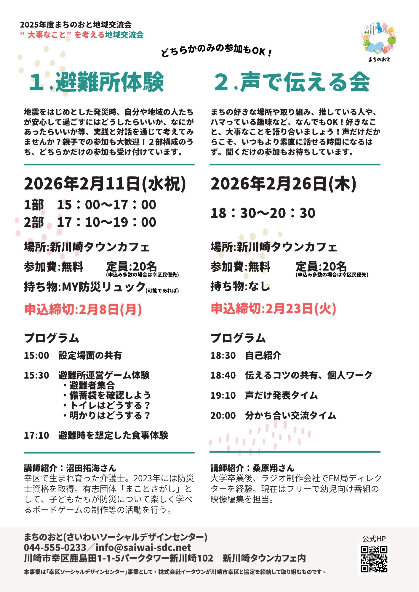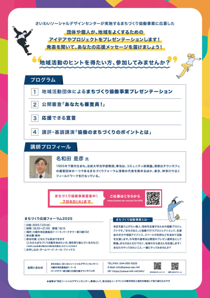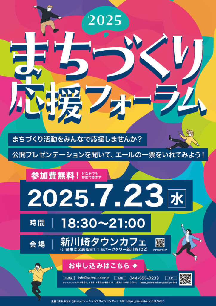 さいわいソーシャルデザインセンターが実施するまちづくり協働事業に応募した団体や個人が、地域をよくするためのアイデアやプロジェクトをプレゼンテーションします!発表を聞いて、あなたの応援メッセージを届けましょう!