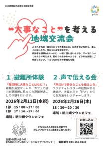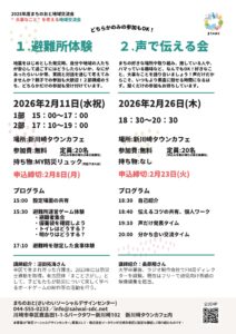 避難所運営ゲームや、カフェの店内を避難所に見立てた避難所過ごしの体験を行います。発災時に、自分や地域の人達が安心して過ごすにはどうしたらいいか、実践と対話を通じて考えてみませんか?